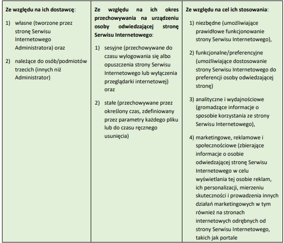 2. Pliki Cookies, które mogą być wysyłane przez stronę Serwisu Internetowego, można podzielić na różne